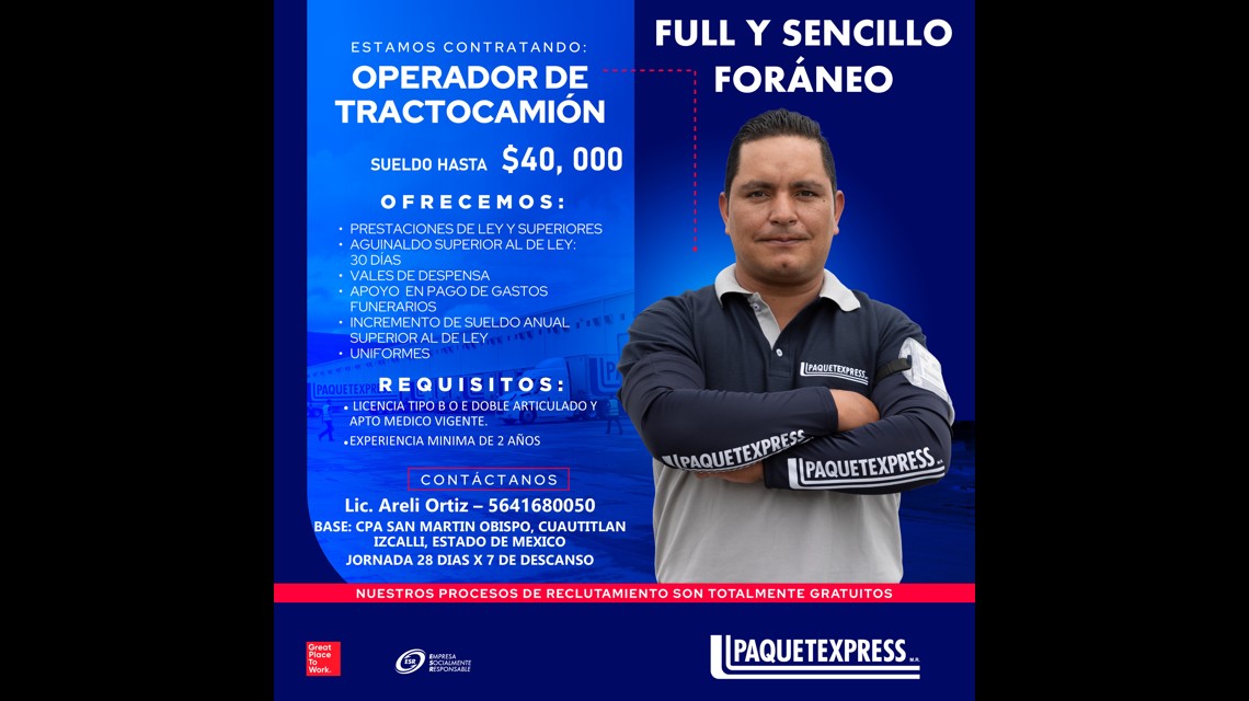 - Experiencia mínima de 2 años como operador de tractocamión.
