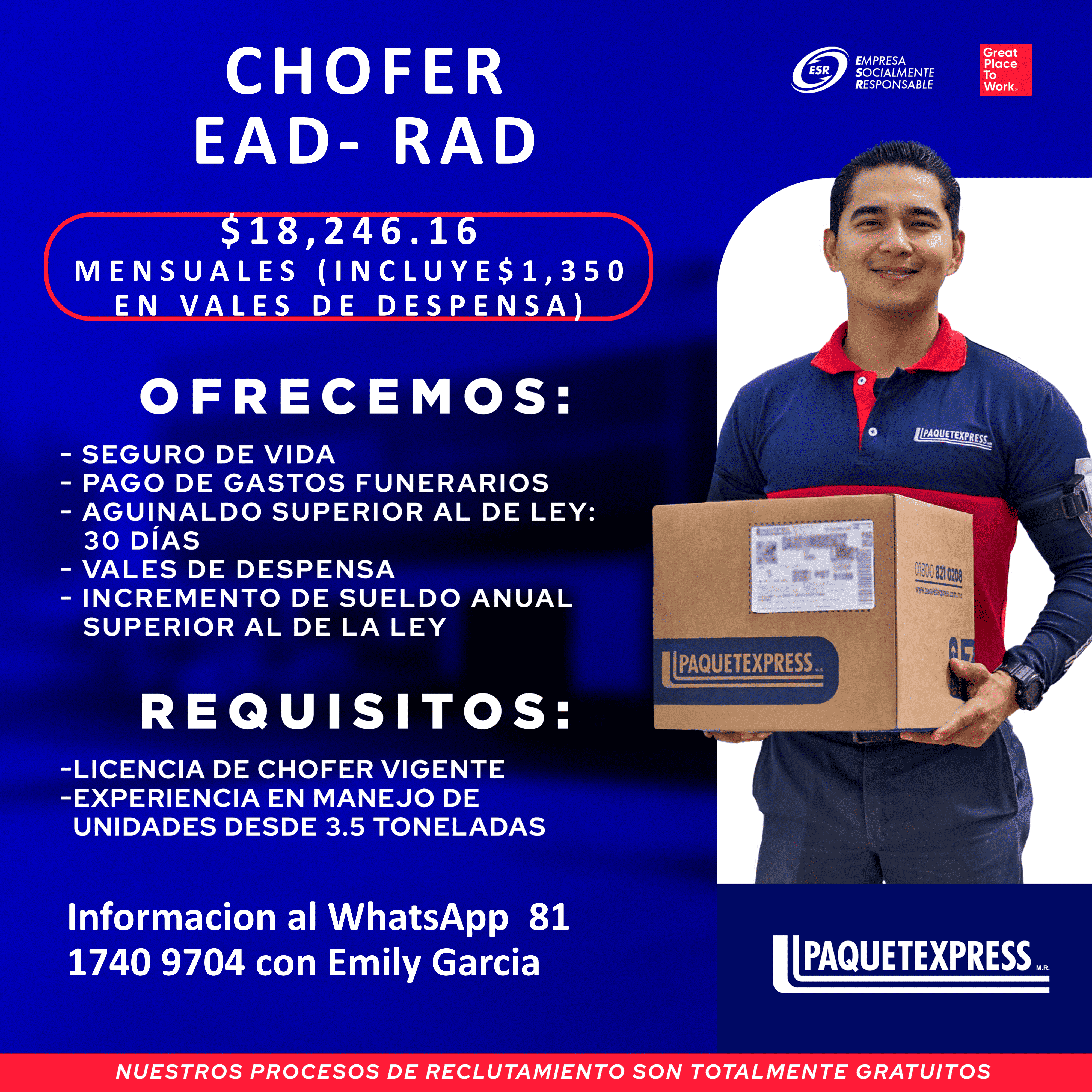 En Paquetexpress, desde hace 38 años movemos lo que más importa. Con cobertura nacional y entregas internacionales, garantizamos soluciones logísticas integrales. Creemos firmemente en relaciones que suman, porque cuando tú creces, nosotros crecemos contigo. Únete a nuestro equipo y sé parte de este gran Familia Azul.