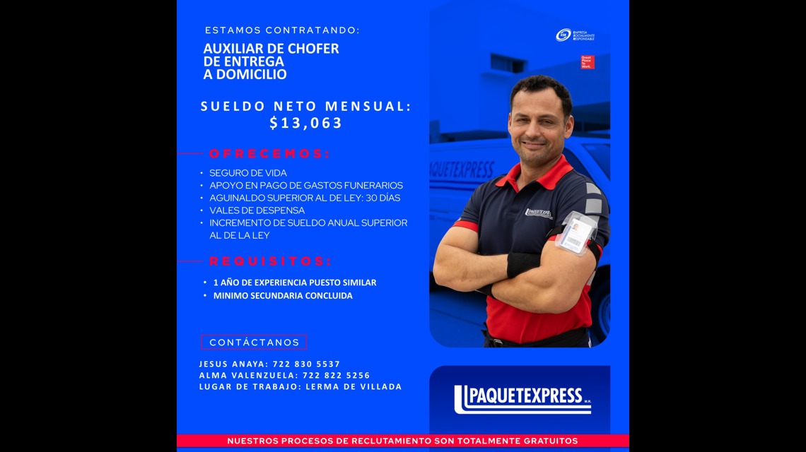 En Paquetexpress, desde hace 38 años movemos lo que más importa. Con cobertura nacional y entregas internacionales, garantizamos soluciones logísticas integrales. Creemos firmemente en relaciones que suman, porque cuando tú creces, nosotros crecemos contigo. Únete a nuestro equipo y sé parte de este gran Familia Azul.